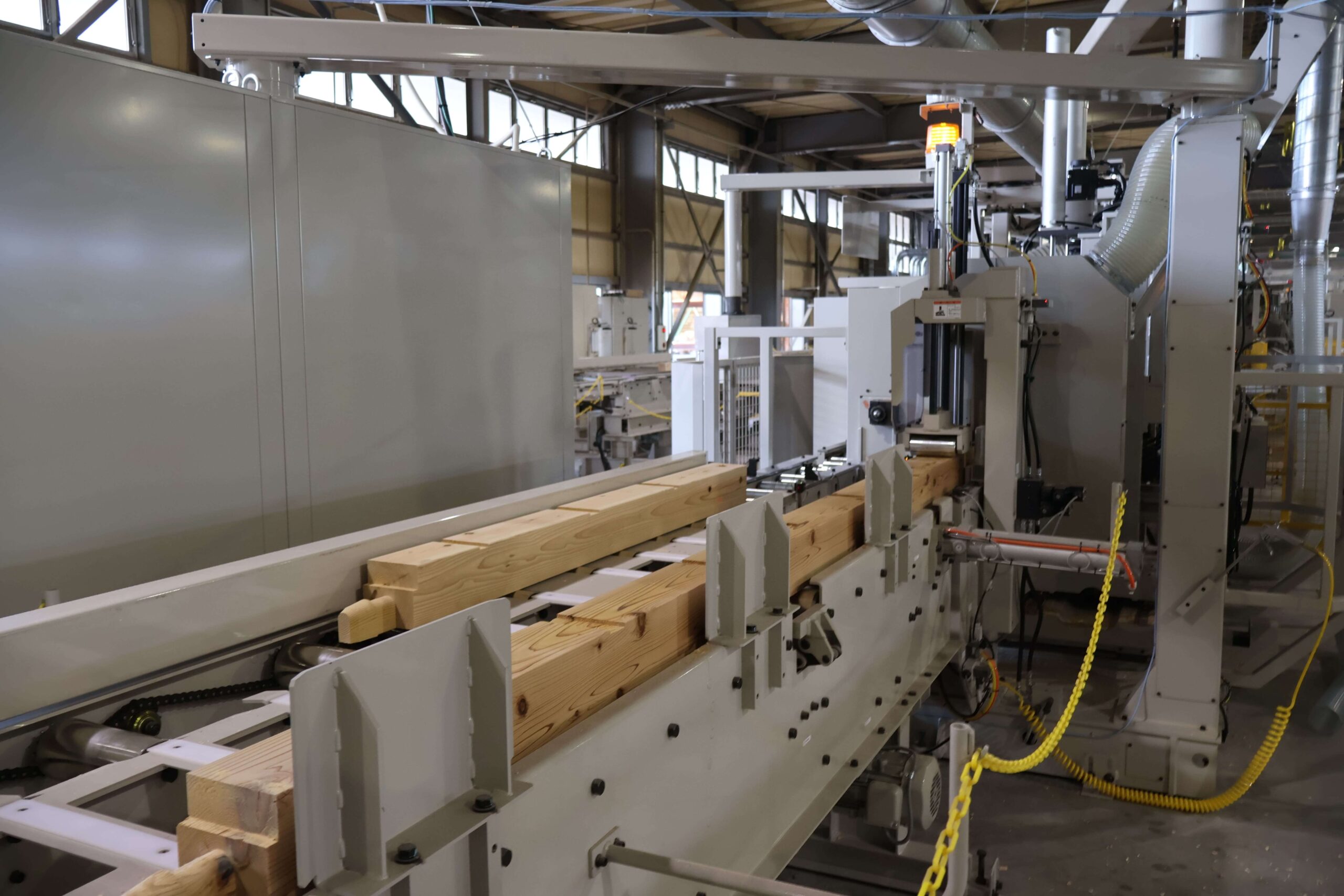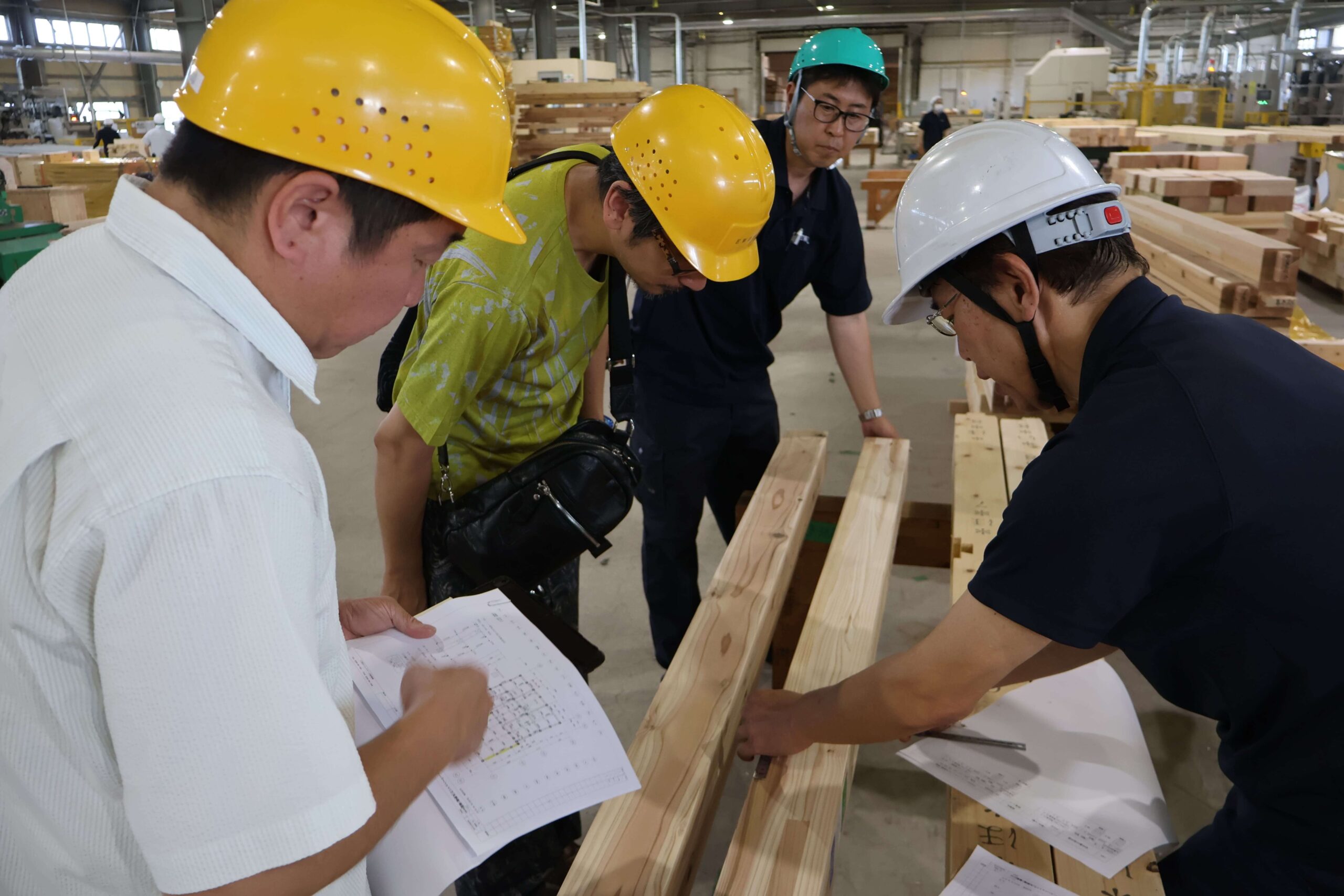 クロスオーバーハット1/2に使用するフレームの検品と工場の見学を行いました。プレカットの8割は機械化され、150棟/1ヶ月のペースを10人の作業員でまわせるそうですか、以前として2割は手加工職人に加工が必要なようです。