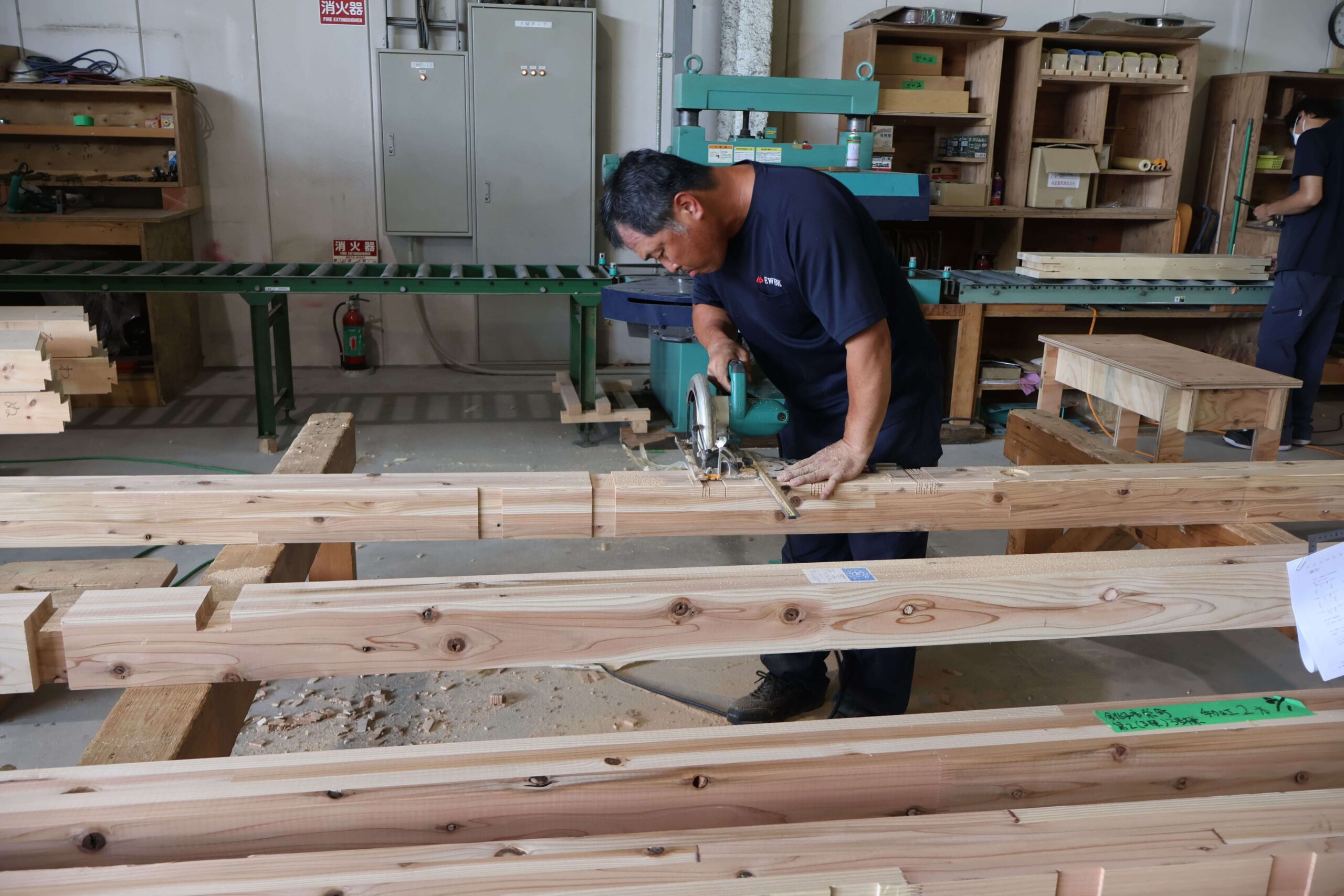 We inspected the frames used for the Xover Hut 1/2 and toured the factory. Apparently, 80% of the pre-cutting is now mechanized, and 10 workers can handle a monthly production of 150 units, but 20% still needs to be processed by hand.