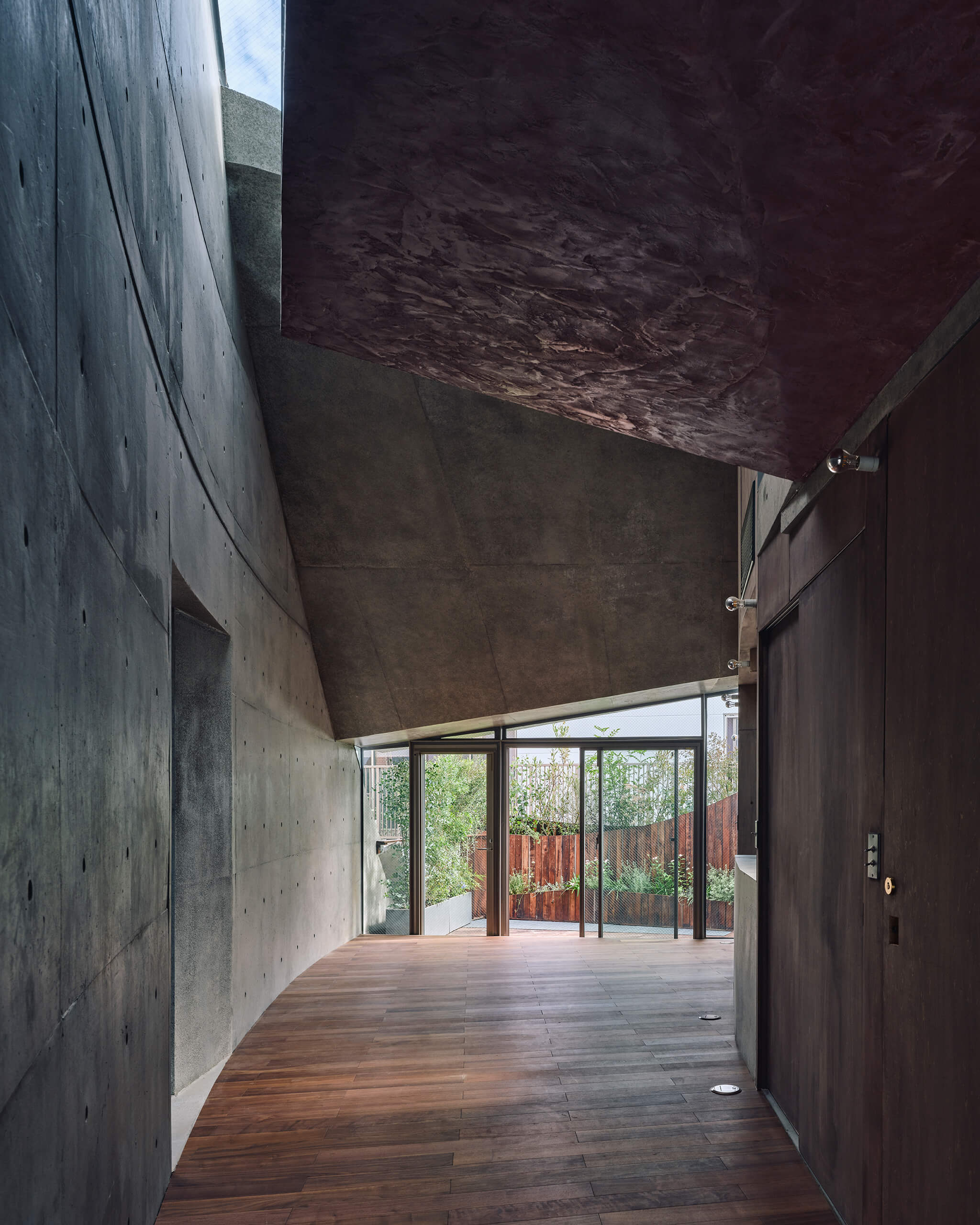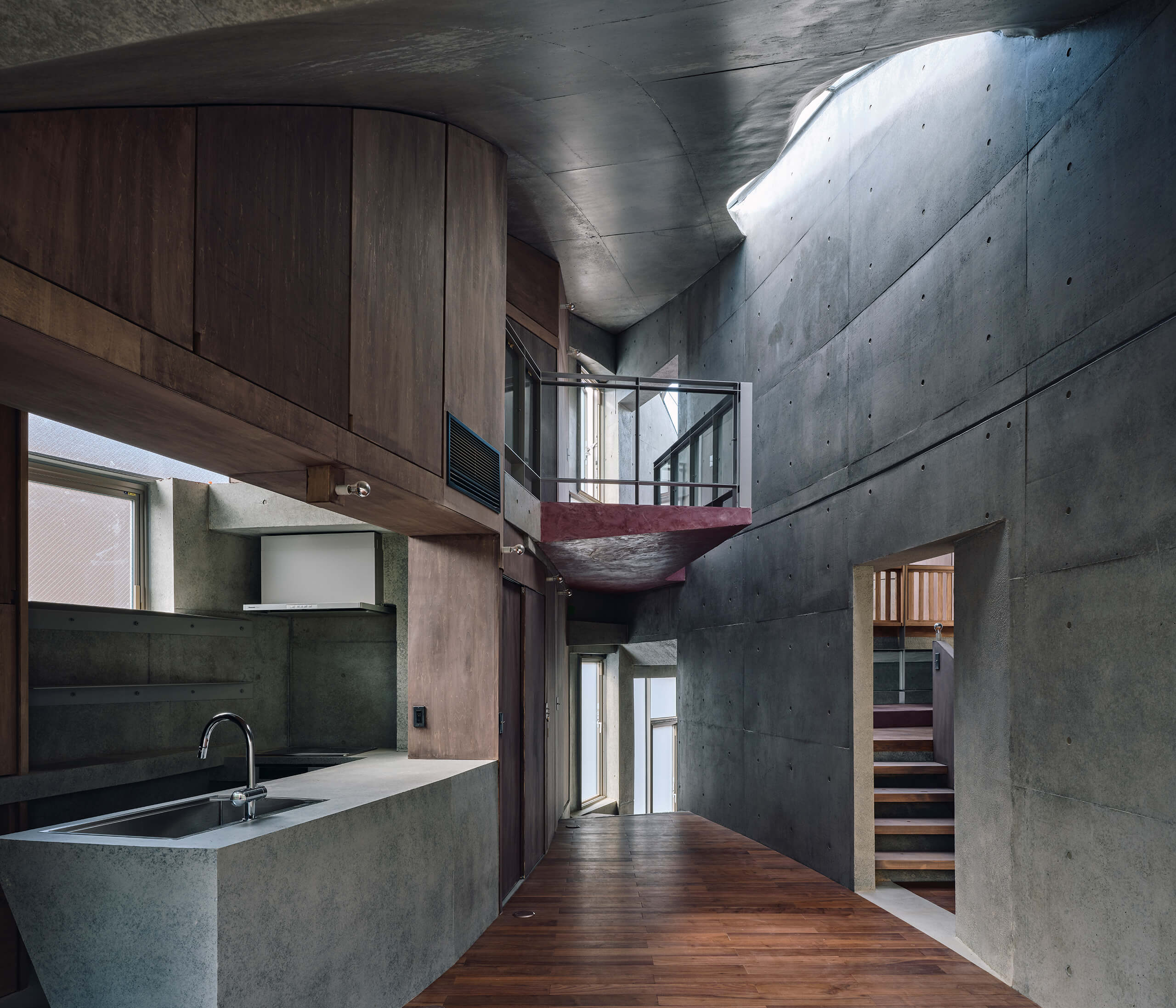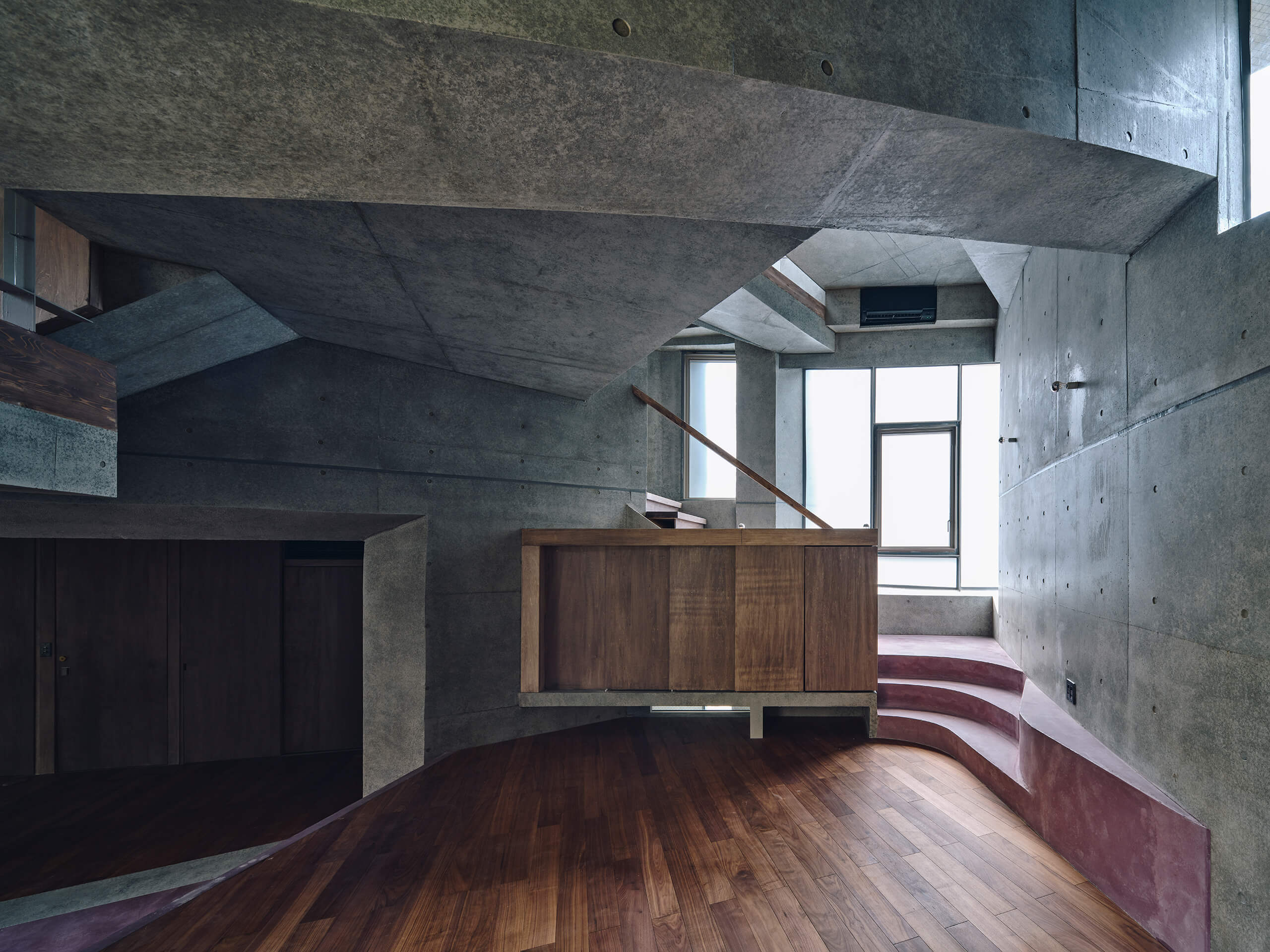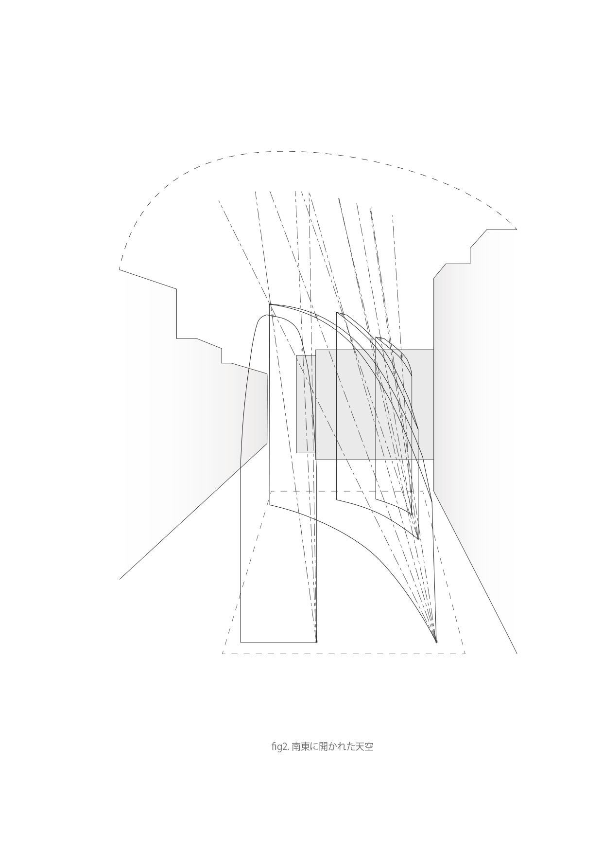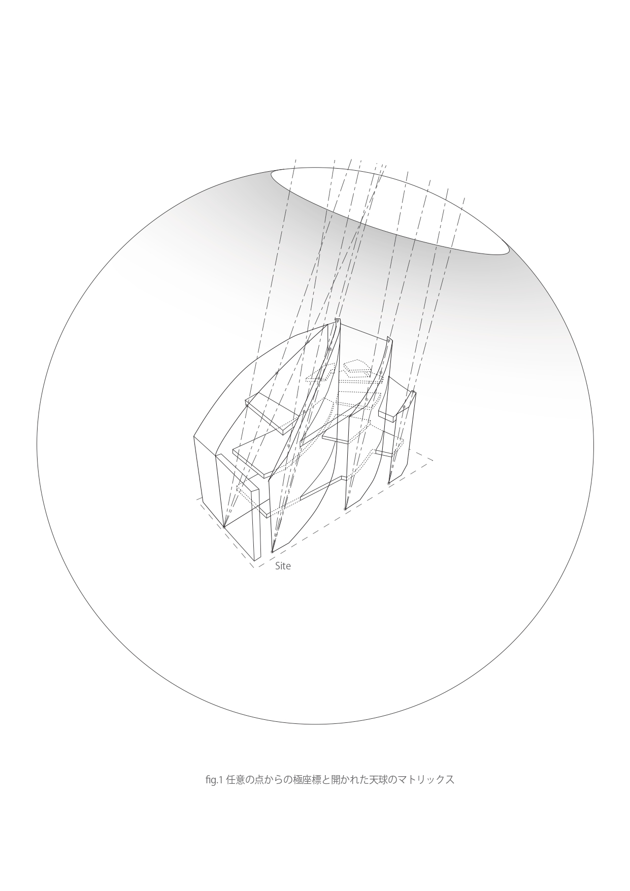 This project is a clinic-residence complex located in central Tokyo.Instead of adopting an XY Carcesian framework that fragments che plot according to the geometry of the city block, the scheme was conceived as if bundling together multiple polar coordinate systems, each drawn from arbitrary points on the site and directed toward the sky. As a result, the consciousness of those within the building is drawn “pulled” toward the southeastern sky, the sole direction in which this site opens beyond the otherwise wholly artificial urban environment.