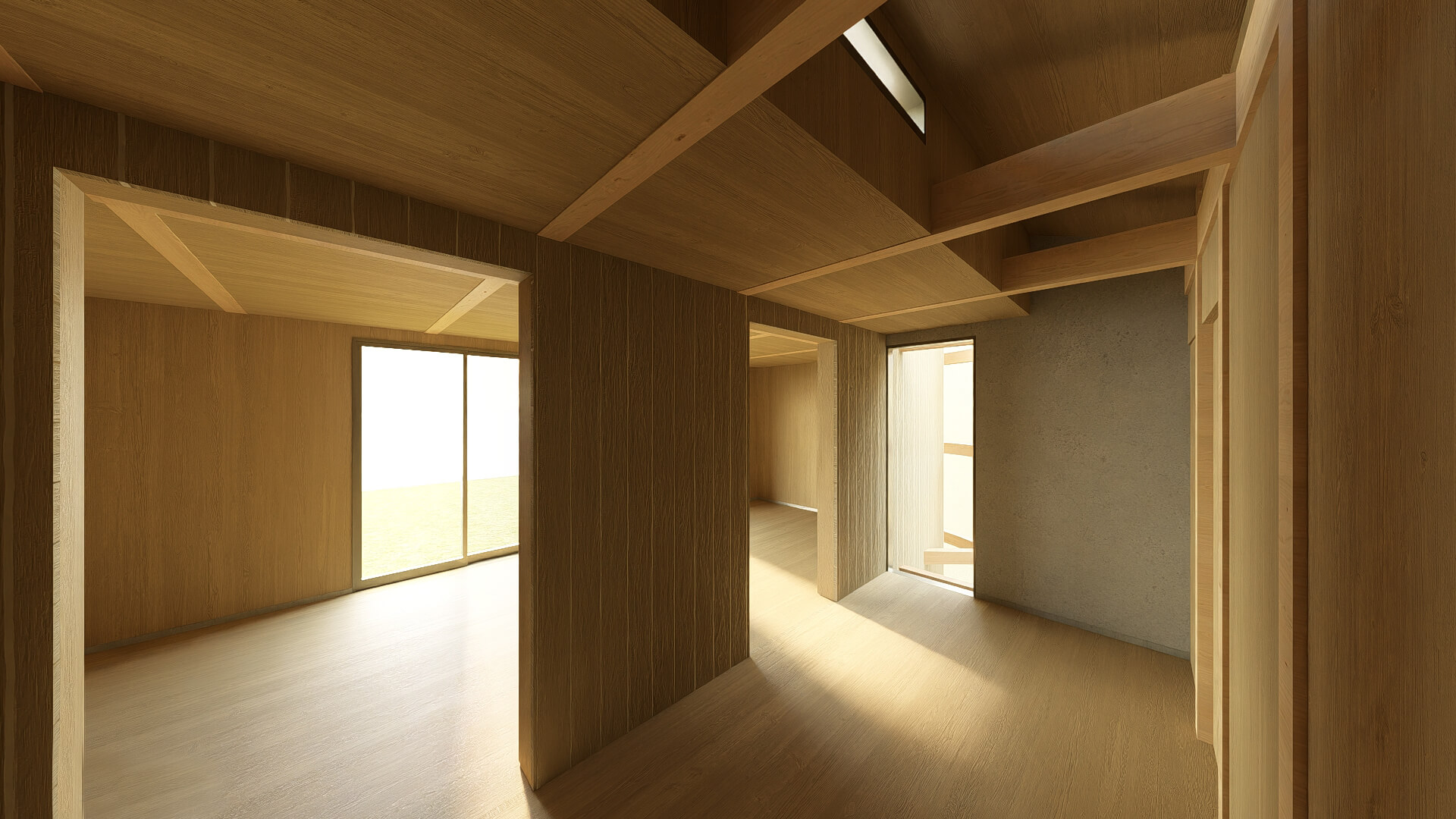 :パネル90枚バージョンを半分に切り、在来軸組工法の水廻り棟と抱き合わせた計画です。ダブルグリッドを基準とすることで、同一図面で建物の切断が可能となります。